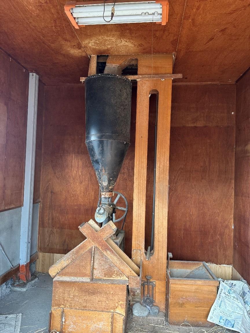 新米の季節を迎えています。三ツ池区に「清水式無砂精米麦機」という大きな円筒型の精米機が残されていました。これは大正10年(1921)に信用販売購買組合が設置した電力精米機で、三ツ池区では10台が稼働していました。かつては生産能力を高めるために石粉を混ぜていましたが、清水式はその必要がないために砂が混じらず、風味良いコメが食べられるようになりました。「天下唯一」を登録商標としたこの機械は、厚生社(農協)でも導入され、精米されたコメは京都へと運ばれていました。