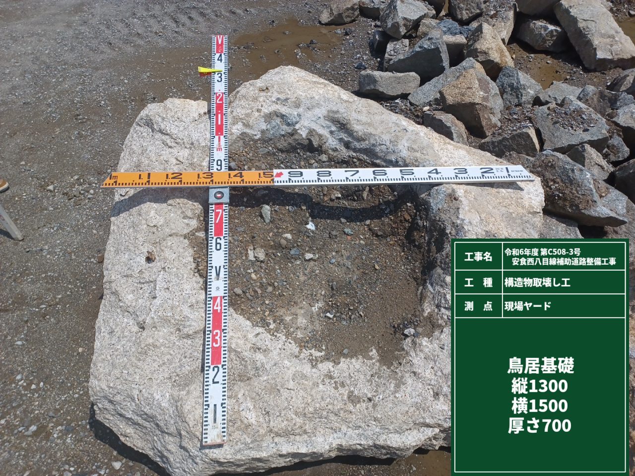 県道安食西八目線のバイパス整備工事の際に、四十九院交差点付近の土中から、かつてここに建っていた阿自岐神社大鳥居の礎石(縦130㎝×横150㎝)が見つかりました。鳥居前の石灯籠は明治37年(1904)3月に近くで呉服商を営んでいた安食南の田中利平次さんと四十九院出身の薩摩治兵衛さんが造立しています。大鳥居は平成15年に道路拡幅工事で移転しましたが、平成24年に強風で一部崩落したため、今は伝わっていません。出土した礎石の大きさに驚くとともに、大鳥居が建っていた頃の懐かしい風景が思い出されます。