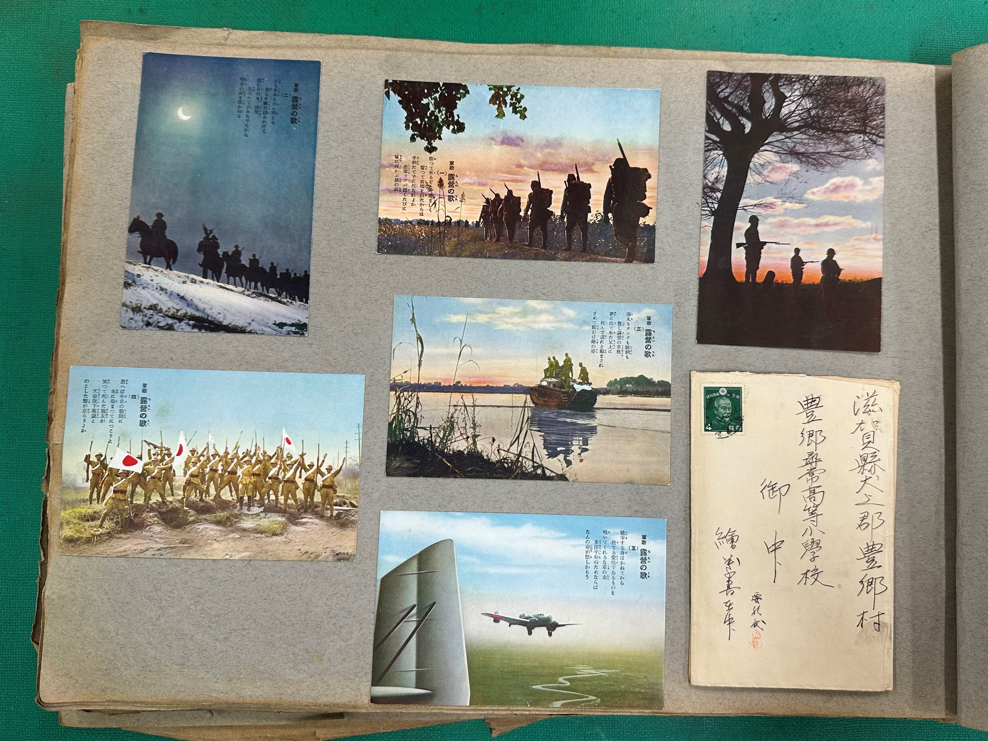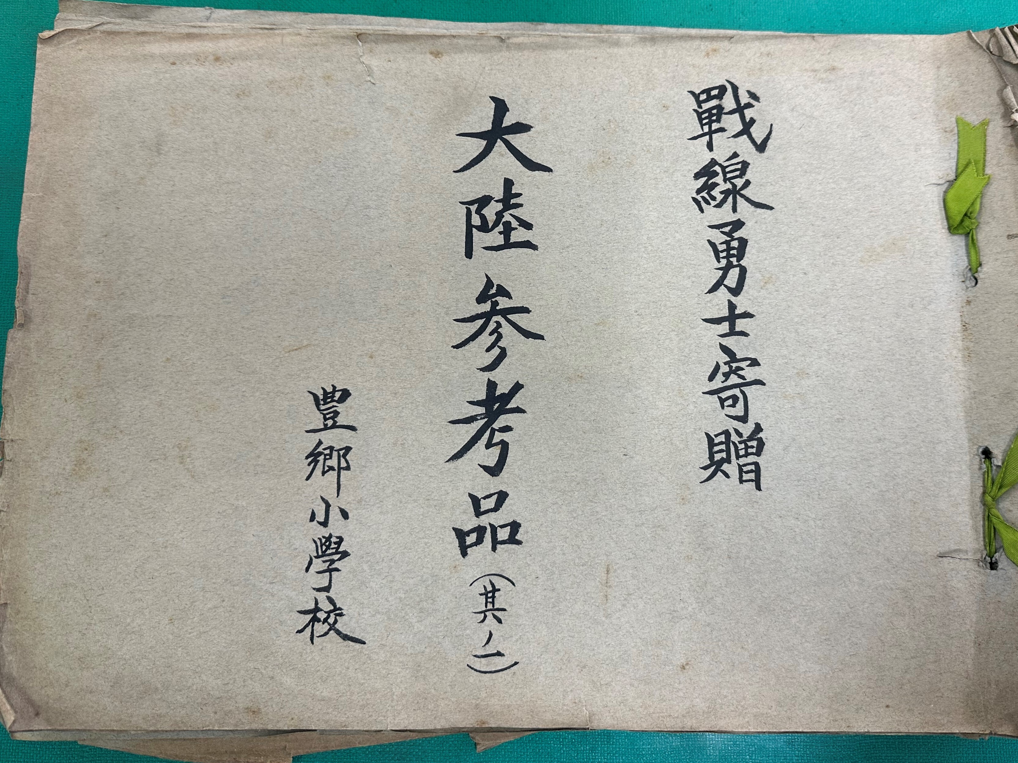 昭和初期には満州事変、日中戦争と対外戦争が続き、豊郷からも多くの方が出征されました。当時の豊郷小学校山中校長は戦地から届いた「軍事郵便」のなかから、戦地の様子が描かれた絵はがきやビラなどを貼り付けて図書館に架蔵し、児童たちの教材としていたようです。『大陸参考品』と名付けられたこの冊子は昭和14年ごろのもので、6冊からなり、豊郷にゆかりのある約50名が小学校に便りを寄せています。