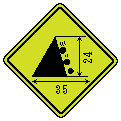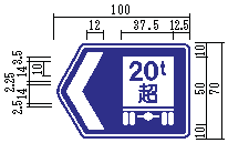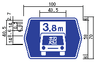 | イ 道路に設置する「駐車場(117-A)」、「総重量限度緩和指定道路(118の3-A)、(118の3-B)」、高さ限度緩和指定道路(118の4-A)、(118の4-B)」および「まわり道(120-A)」を表示する案内標識ならびに警戒標識については、道路の形状または交通の状況により必要がある場合にあっては図示の寸法(アに規定するところにより図示の横寸法を拡大する場合にあっては、当該拡大後の図示の寸法)の1.3倍、1.6倍または2倍に、それぞれ拡大することができる。 | |