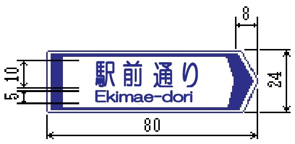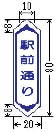 | エ 「市町村(101)」ならびに「方面、方向および距離(105-A)、(105-B)、(105-C)」、「方面および距離(106-A)、(106-B)」、「方面および方向の予告(108-A)、(108-B)」、「方面および方向(108の2-A)、(108の2-B)」「方面、方向および道路の通称名の予告(108の3)」、「方面、方向および道路の通称名(108の4)」および「著名地点(114-A)、(114-B)、(114-C)」を表示する案内標識に、それぞれ町章および公共施設等の形状等を表す記号を表示する場合の当該記号の大きさは、日本字の大きさの1.7倍以下の大きさとする。 | |