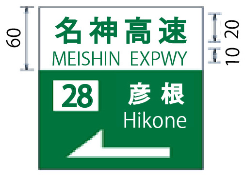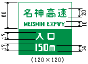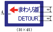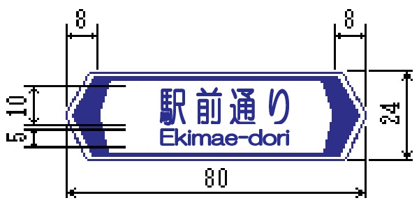 | (ア) 案内標識 縁は、「待避所(116の3)」、「駐車場(117-A)」および「まわり道(120-B)」を表示するものについては9ミリメートル、「総重量限度緩和指定道路(118の3-A)(118の3-B)」および「高さ限度緩和指定道路(118の4-A)、(118の4-B)」を表示するものについては16ミリメートル、「登坂車線(117の2-A)」を表示するものについては10ミリメートル、「国道番号(118-B・C)」、「道路の通称名(119-A)、(119-B)、(119-C)」を表示するものについては8ミリメートル、その他のものについては日本字の大きさの20分の1以上の太さとし、縁線および区分線は、日本字の大きさの20分の1以上の太さとする。 | |